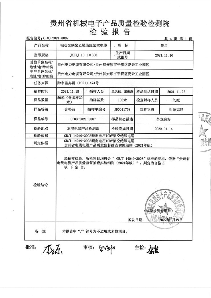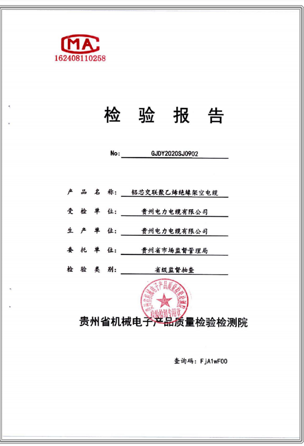 鋁芯交聯(lián)聚乙烯絕緣架空電纜 檢驗報告