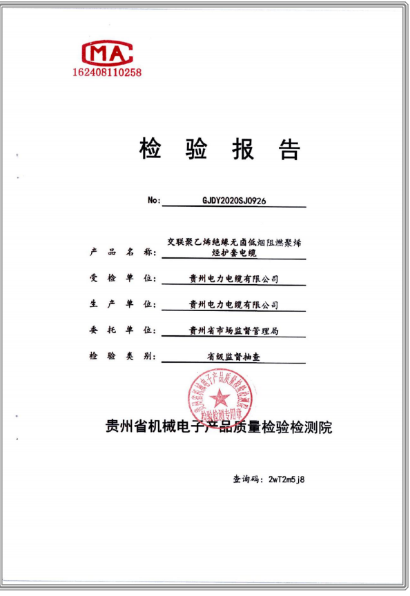 交聯(lián)聚乙烯絕緣無鹵低煙阻燃聚烯烴護套電纜 檢驗報告