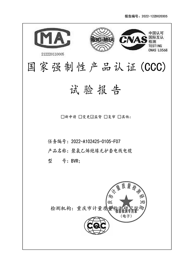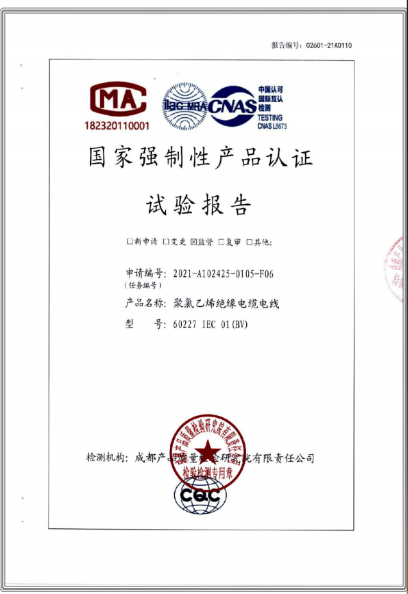 聚氯乙烯乙烯絕緣電纜電線 國家強制性產(chǎn)品試驗認證報告